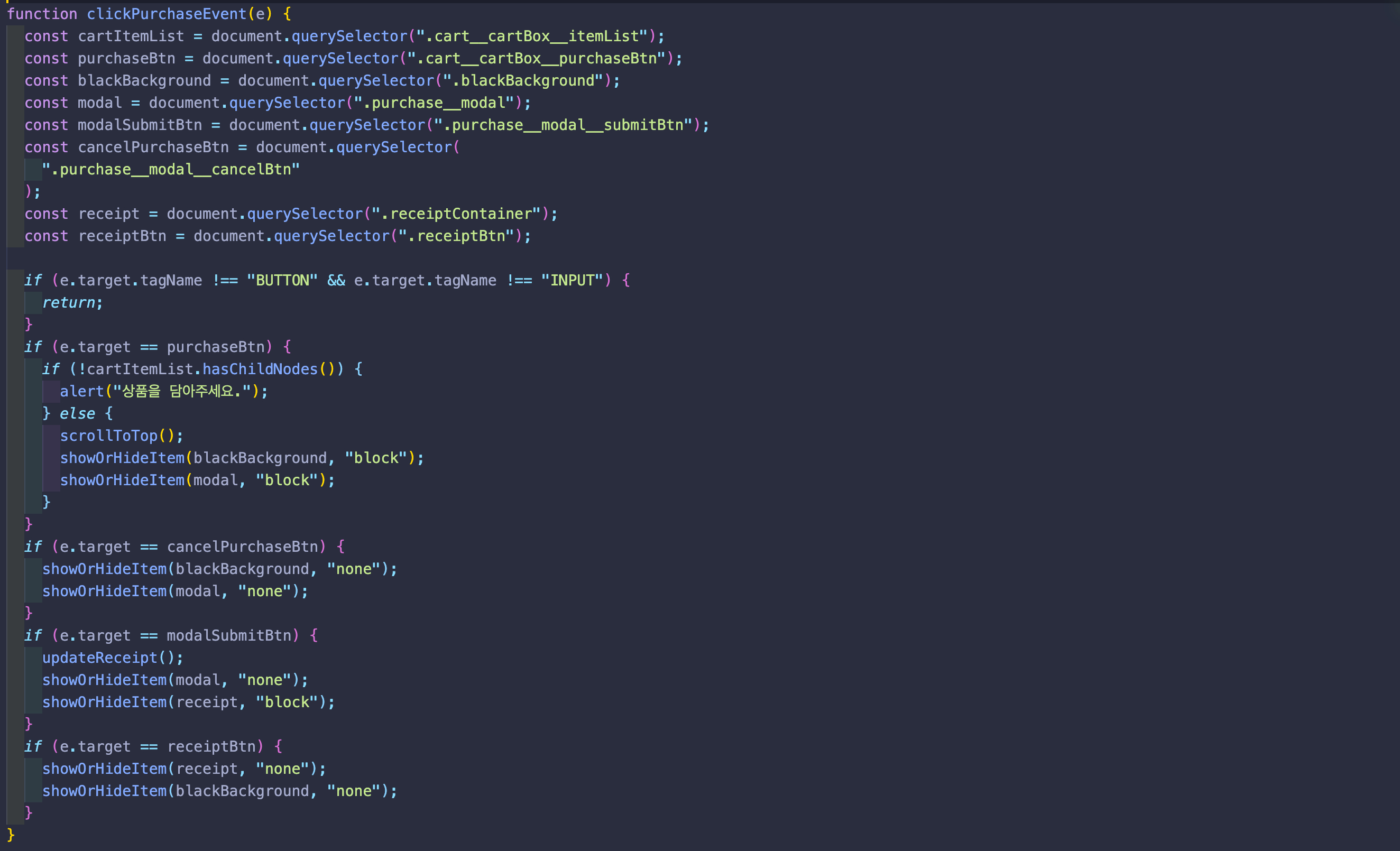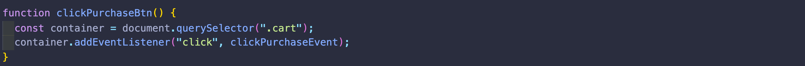 구매 버튼과 관련된 함수인데, addEventListener를 여러개 만드는게 지저분하게 느껴져서 이벤트 리스너를 아예 컨테이너 전체에 줘버리고 타겟을 일일히 지정해줬으나.. 이게 더 지저분한 것 같다.