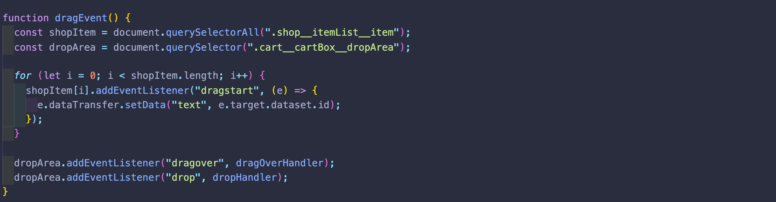 바닐라 자바스크립트 드래그앤 드롭 API는 여러 복잡한 과정을 거쳐서 실행되지만 나는 dragstart(드래그 시작), dragover(드롭 대상 위를 지날 떄), drop(드래그한 요소를 드롭할 때) 이 세가지만 사용했다. 자세하게 알고 싶으면 여기서 확인하도록 하자.