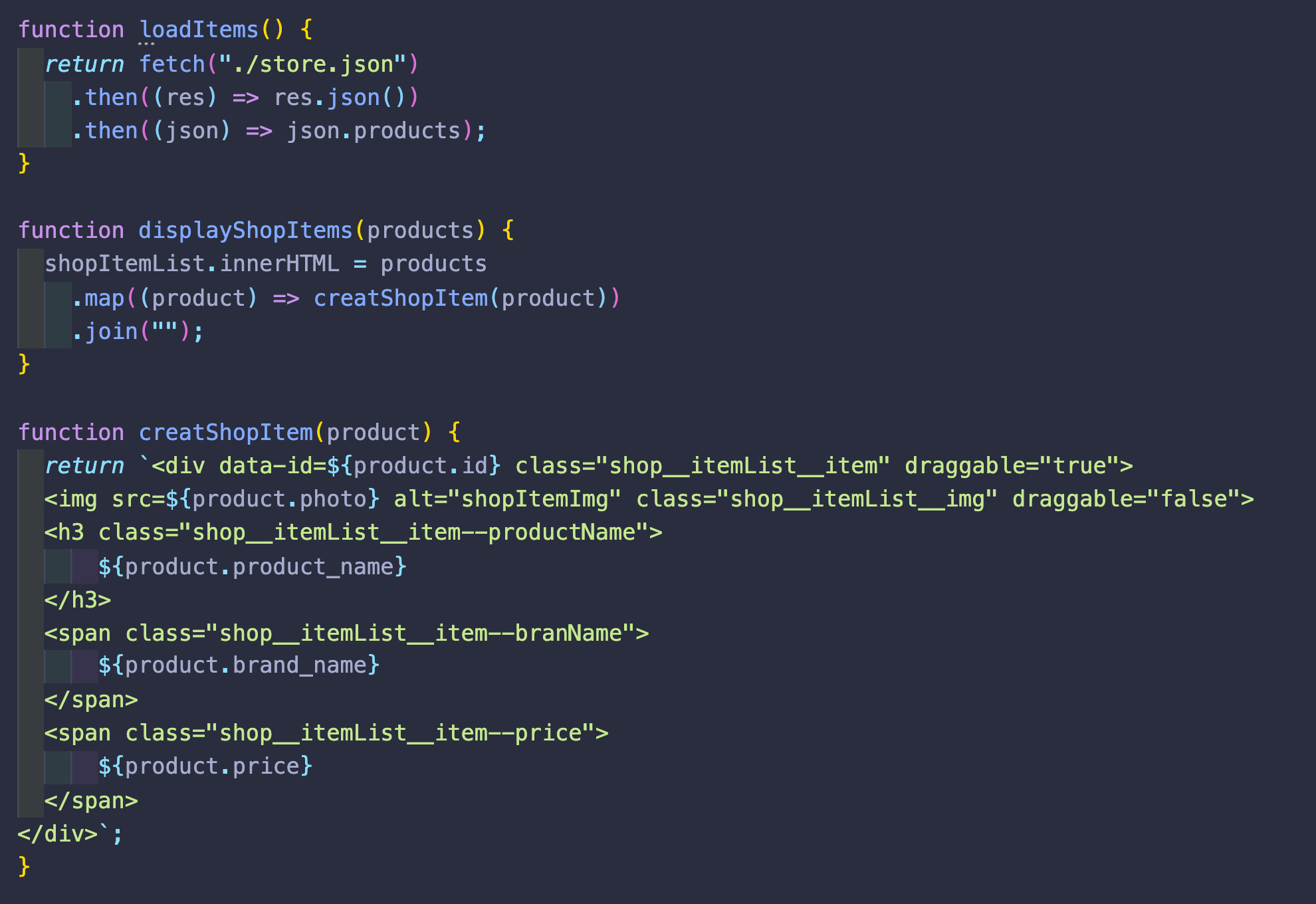 처음 시도했을 당시에는 먼저 HTML을 받아온 뒤 각 클래스를 선언하고 거기에 받아온 json의 데이터를 넣어주는 아주 비효율적인 방식으로 코드를 작성했었는데, 드림코딩에서 배운대로 map과 join을 활용하여 깔끔하게 해결할 수 있었다.