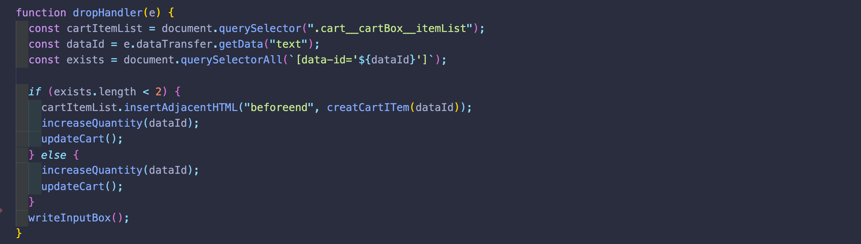 가져온 데이터를 querySelectorAll로 선언해주고 length로 해당 데이터가 카트에 이미 존재하는지 체크한다.