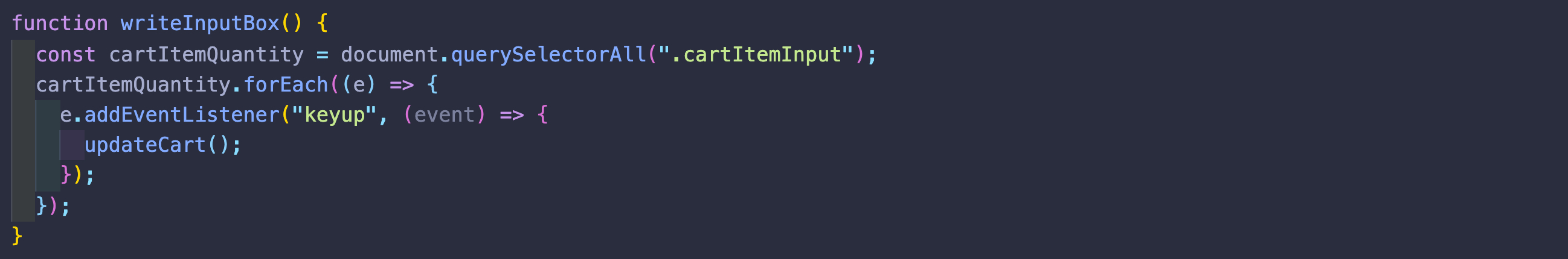 장바구니의 인풋 박스에 수량을 변경해주면 total 금액과 상품 금액을 변경시켜주기 위해 만든 함수인데