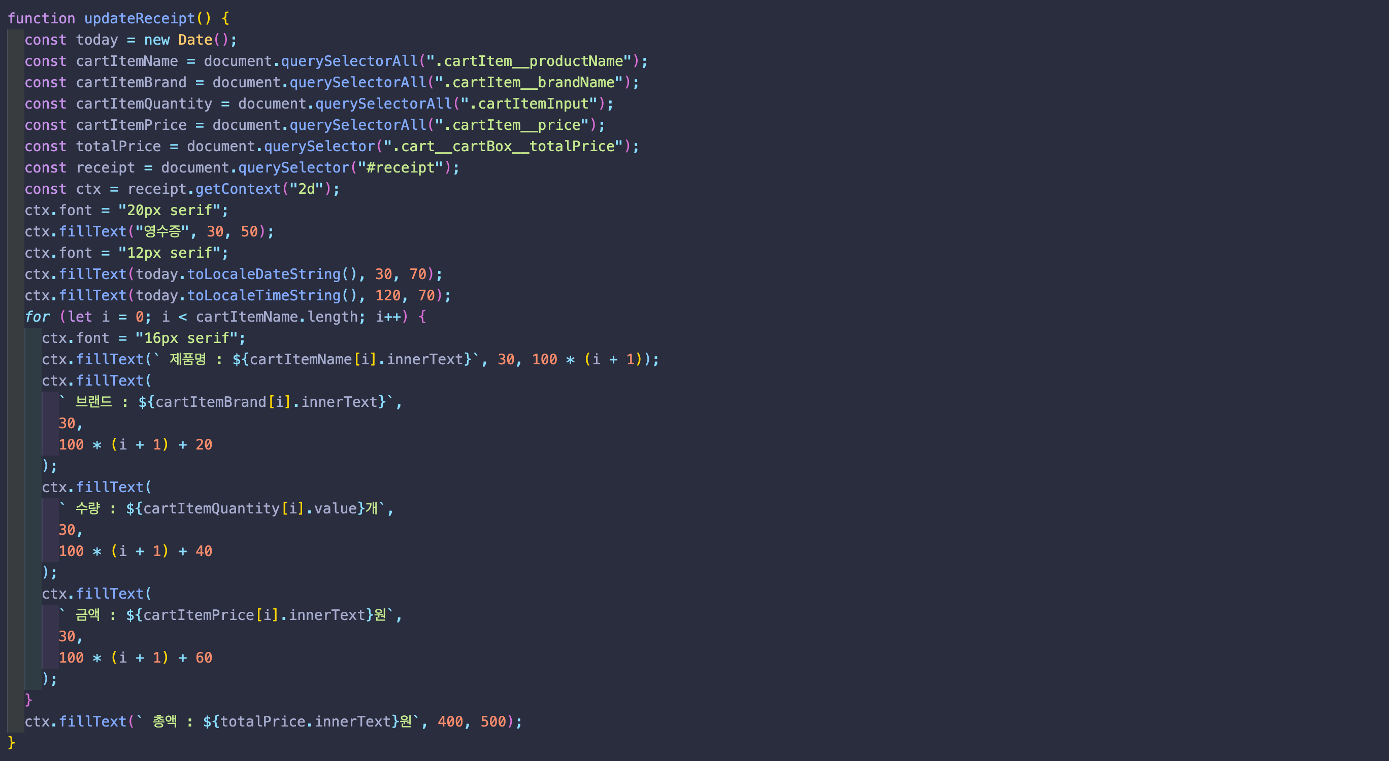 ctx.fillText(` 총액 : ${totalPrice.innerText}원`, 400, 500);