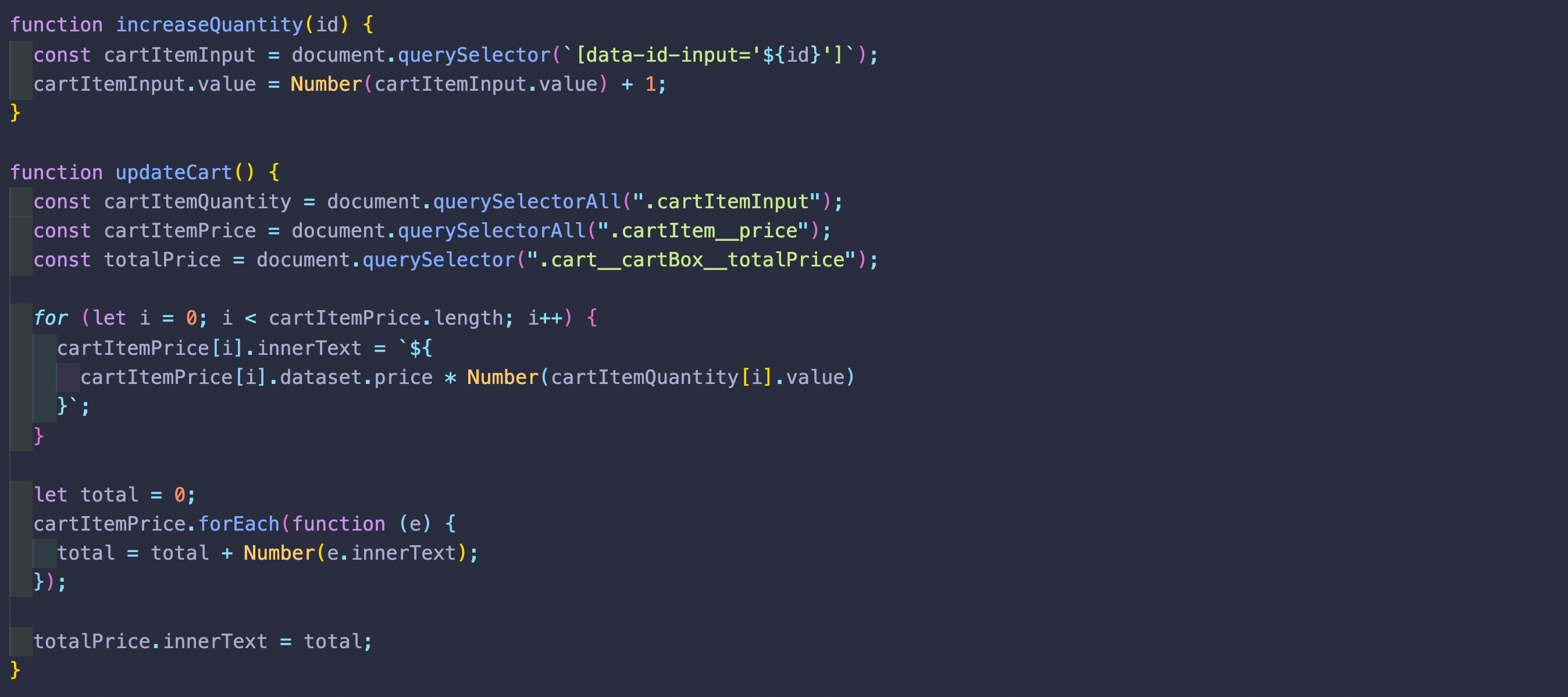 만약 이미 카트에 있을 경우 increaseQuantity함수로 수량을 증가시키고 updateCart함수로 제품 금액 및 토탈 금액을 변경한다.