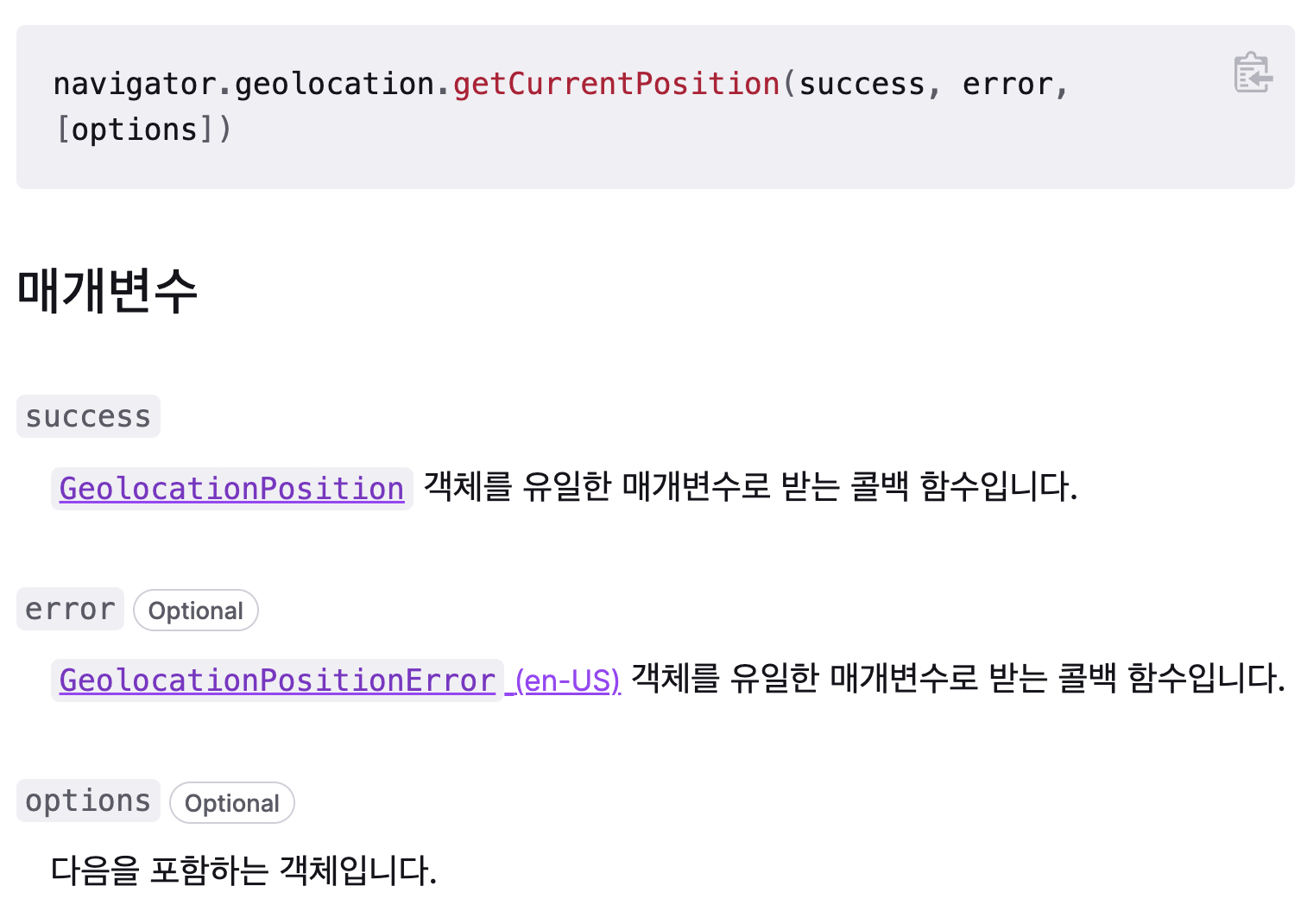 (getCurrentPosition은 한 번 받아오는 것이고 getWatchPosition은 꾸준히 받아오는 것 (ex> 지도앱) )
