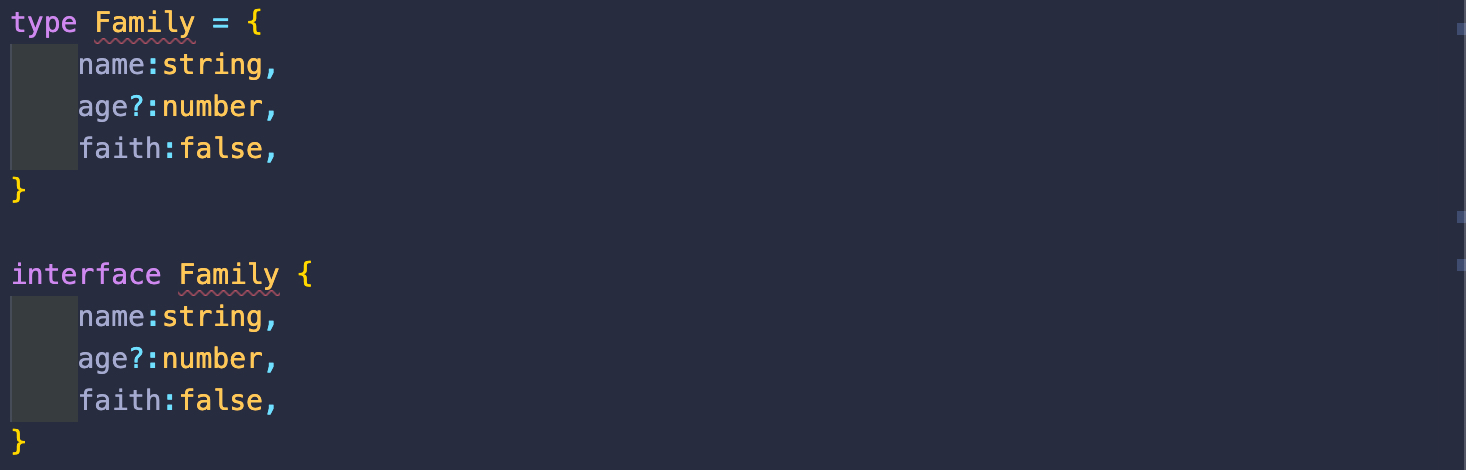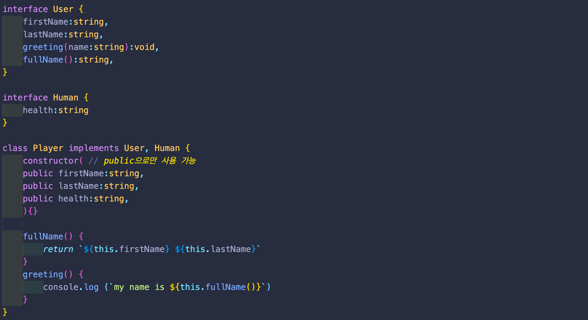 그러나 유일한 단점이 있으니 interface에서는 접근 제한자를 설정해줄 방법이 없다는 것이다. 접근 제한자를 사용해야 한다면 type을 사용하는 수 밖에 없다.
